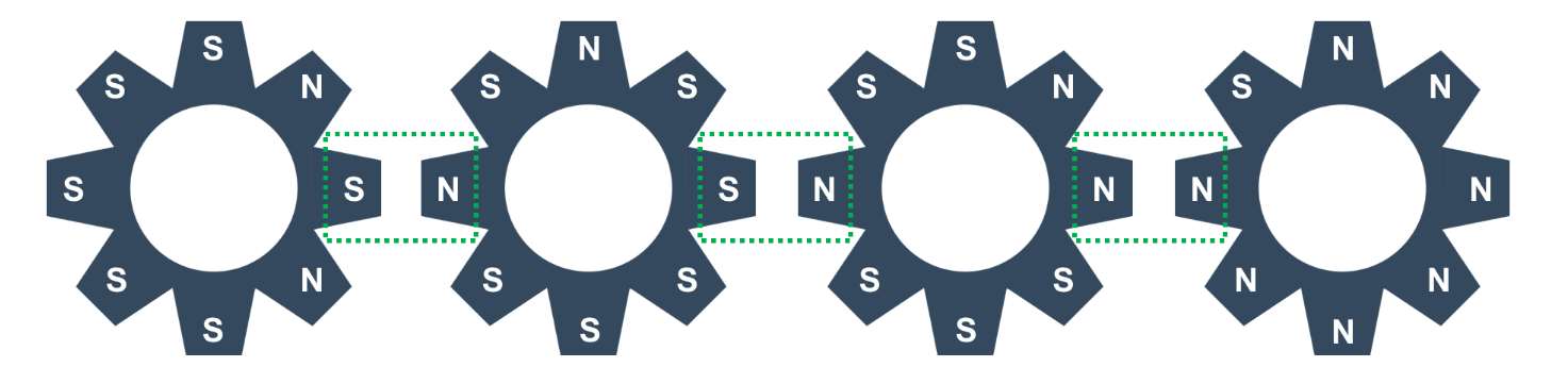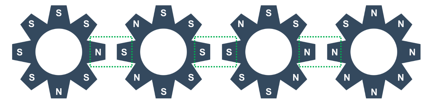 또, 톱니는 N극 또는 S극 중 하나를 나타내고 있다.