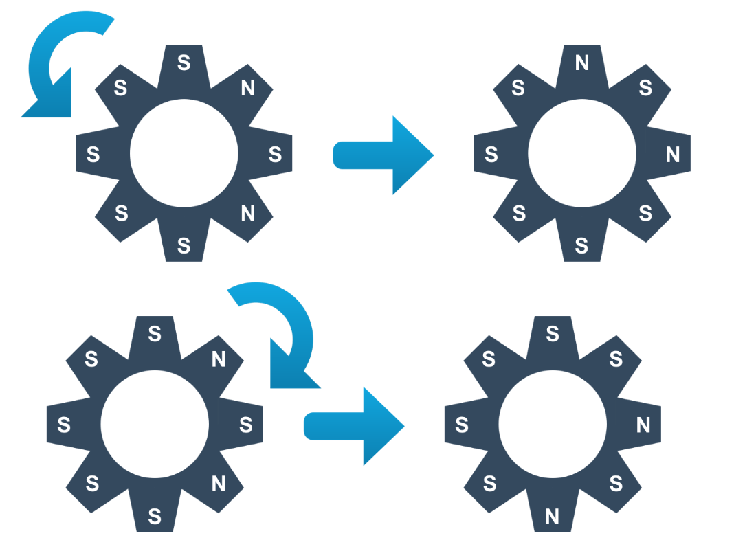 톱니바퀴가 회전할 때, 서로 맞닿은 극에 따라서